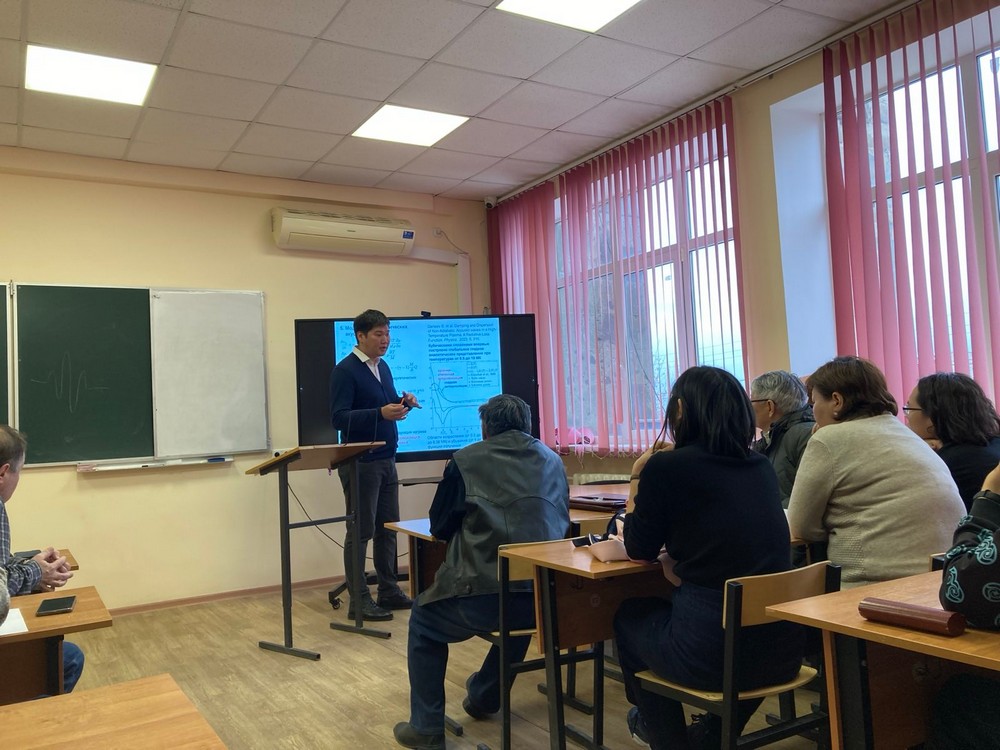 7 ноября состоялся совместный семинар кафедр теоретической физики и экспериментальной и общей физики. Семинар был посвящен 55 — летию научно — педагогической деятельности Павлова Санл Дорджиевича. Павлов С.Д. являлся одним из основателей физического образования в университете, начиная с самого его открытия. Были сказаны теплые слова о нем и его научной и педагогической деятельности. Продолжая славную традицию, участники семинара — преподаватели, декан и студенты обсуждали и слушали доклад руководителя научной лаборатории «Физика Солнца» Дертеева С.Б. на тему: «Распространение неадиабатических акустических волн в плазме солнечной короны».
