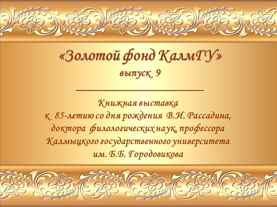 Познакомиться с научным наследием Валентина Ивановича можно в научной библиотеке, в перечень задач которой входит культурно-просветительская функция. Все мероприятия университета сопровождаются книжными выставками, презентациями. К юбилею В.И. Рассадина сотрудниками отдела обслуживания подготовлена презентация «Легенда монголоведения, алтаистики и тюркологии» http://lib.kalmsu.ru:8087/jirbis2/attachments/article/1233/Zolotoyfond%20Rassadin.pdf.