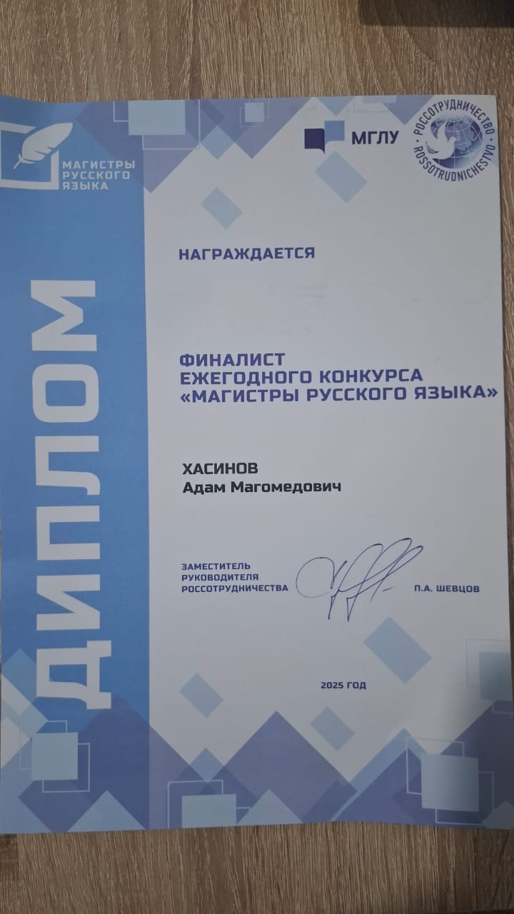 Хасинов Адам по результатам двух туров стал финалистом конкурса и был приглашен 30 сентября 2025 года в МГЛУ на мероприятие, в рамках которого была реализована дополнительная образовательная программа, организованная Россотрудничеством совместно с университетом.