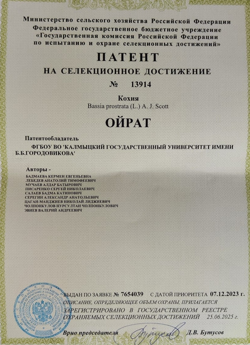 В КалмГУ создан новый сорт кохии простертой (Kochia prostrata (L.) Schrad) – «Ойрат». На хозяйственную полезность нового сорт кохии (прутняка) «Ойрат» получена экспертная оценка и выдан патент на селекционное достижение № 13914. Патентообладателем является Калмыцкий государственный университет.