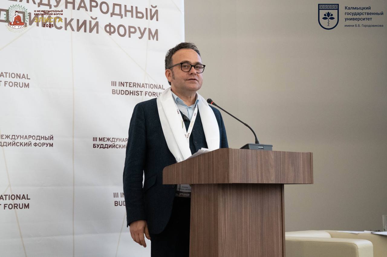 Модератором сессии выступил доктор культурологии, профессор Санкт-Петербургского государственного университета Анатолий Алексеев-Апраксин. Он связал свою научную деятельность с буддийской культурой. Его дипломная работа была посвящена живописи Тханка, материал для которой он собирал в Элисте. «Я сотрудничаю с коллегами из калмыцкого университета, это всегда очень вдохновляющий опыт. То, что я видел на пленарной части, произвело очень большое впечатление. Это, конечно, действительно очень здорово, что представители разных стран и культур объединены общими идеями и эмоциями. Надо развивать сотрудничество, это очень хорошая инициатива», – поделился профессор.