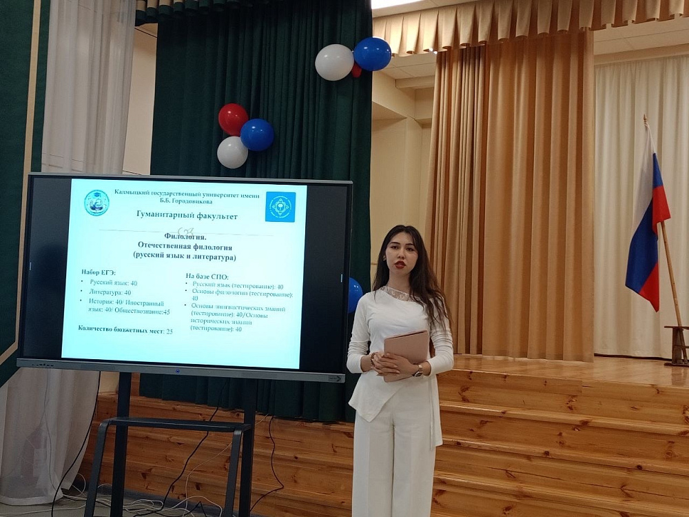 В минувшую пятницу представители КалмГУ в лице доцентов кафедры русского языка и общего языкознания, русской и зарубежной литературы Кичиковой Н.А. и Микитенко Н.Ю., а также студентов 4 курса направления «Отечественная филология (русский язык и литература)» Шихановой Санды и Хамраевой Сельби провели встречу для обучающихся 10 и 11 классов СОШ №23 г. Элиста.