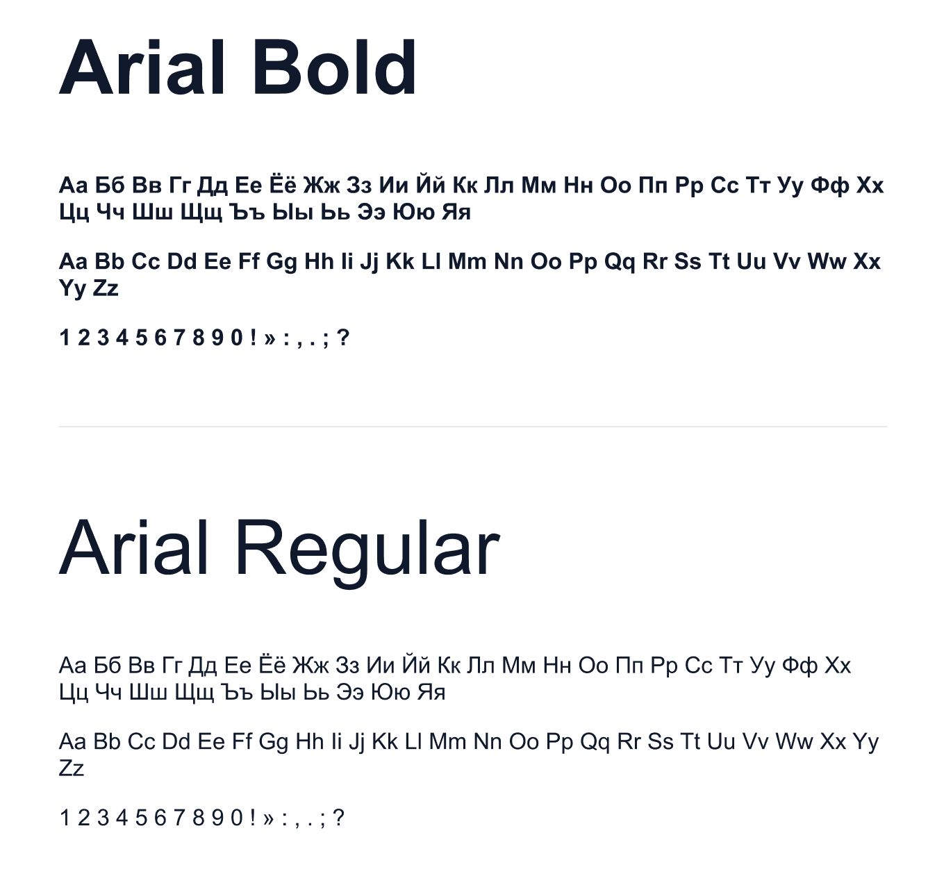 Шрифт Arial является системной гарнитурой и применяется для оформления документов и в случаях, когда нет возможности использовать основной шрифт.